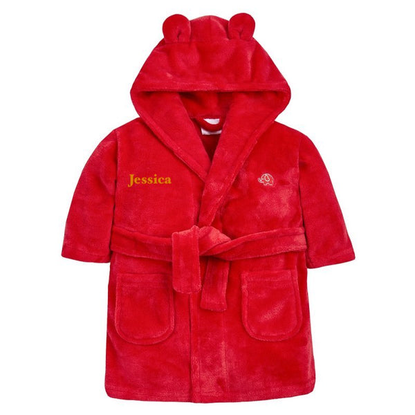Let your little one look their best in this festive Babies personalised Red hooded dressing gown. Made from super soft material, it features an elephant embroidery to the chest as well as detailing pom pom ears and a hood. Make it extra special by adding a personalised touch. Perfect for keeping your baby warm during the holidays. This item will be embroidered.
