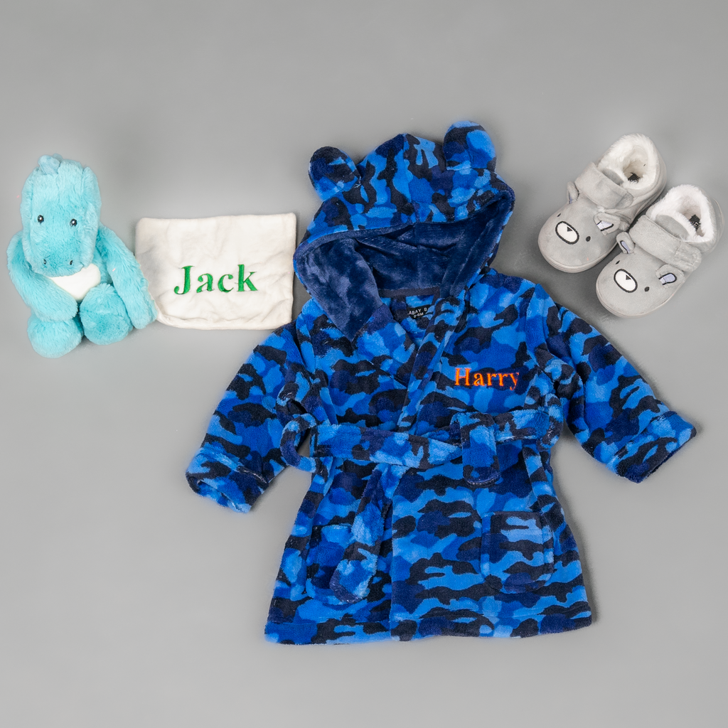 Lulabay baby boys 3 piece personalised Camo gown, slipper and dinosaur gift set