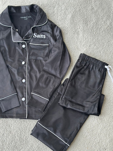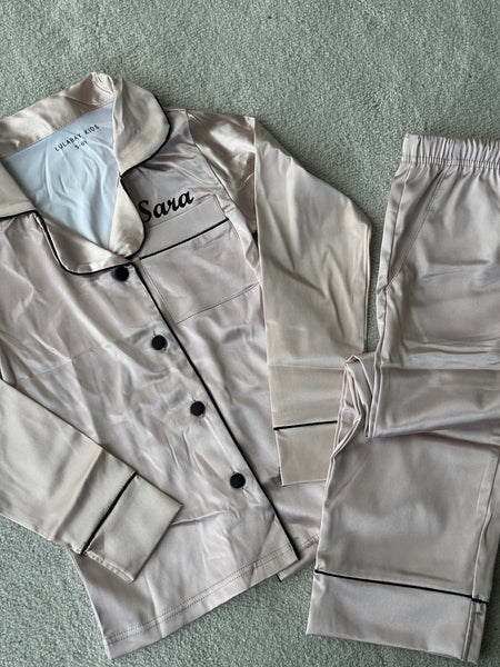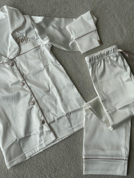 Let us introduce our beautifully soft silky satin pyjamas in a range of different colours in our unisex design. Whether you are planning a girls night in with your little one or getting ready for your wedding day we have the personalised pyjamas for you. These include a button up shirt with your personalised name above the pocket and trousers, with pockets on either side and an adjustable tie around the waist. The perfect personalised gift for children!
