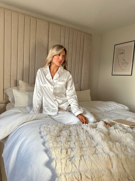 Our super soft personalised satin pyjamas are the perfect pair of pyjamas to get snuggled down in. Available in 6 different colours, there is a personalised pair perfect for everyone. Crafted from super soft stretchy satin fabric, a relaxed fit and satin buttons, piping and adjustable tie around the waist in a contrast colour. Complete with pockets on either side of the trousers and a special touch of personalisation above the shirt pocket to make the perfect personalised gift for her.